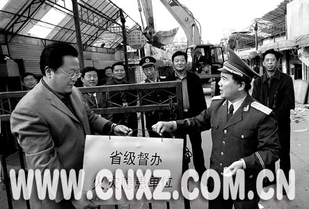 11月8日下午,省級督辦、市級掛牌的我市重大火災(zāi)隱患單位宣武市場,由于其東市場的整體拆除而摘下了警示牌。這是我市歷史上第一次對重大火災(zāi)隱患部位實施整體拆除。明年,一個現(xiàn)代化的新市場將在原址建成。