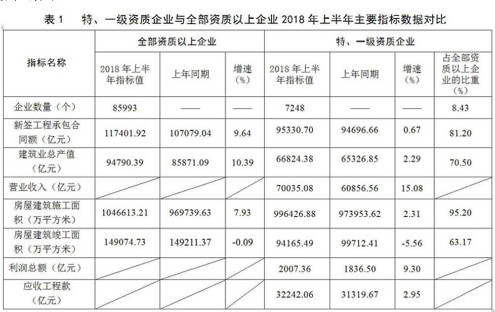 住房和城鄉(xiāng)建設部匯總的7248個特、一級資質建筑業(yè)企業(yè)2018年上半年主要指標數(shù)據(jù)如下(表1)。